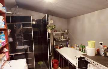 Különlegesen nagy fürdőszoba, ahol a kényelemről egy kád és egy épített zuhanykabin is gondoskodik.